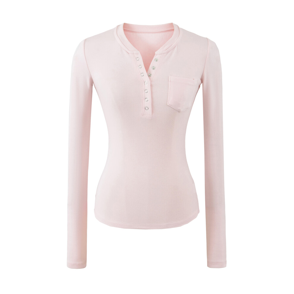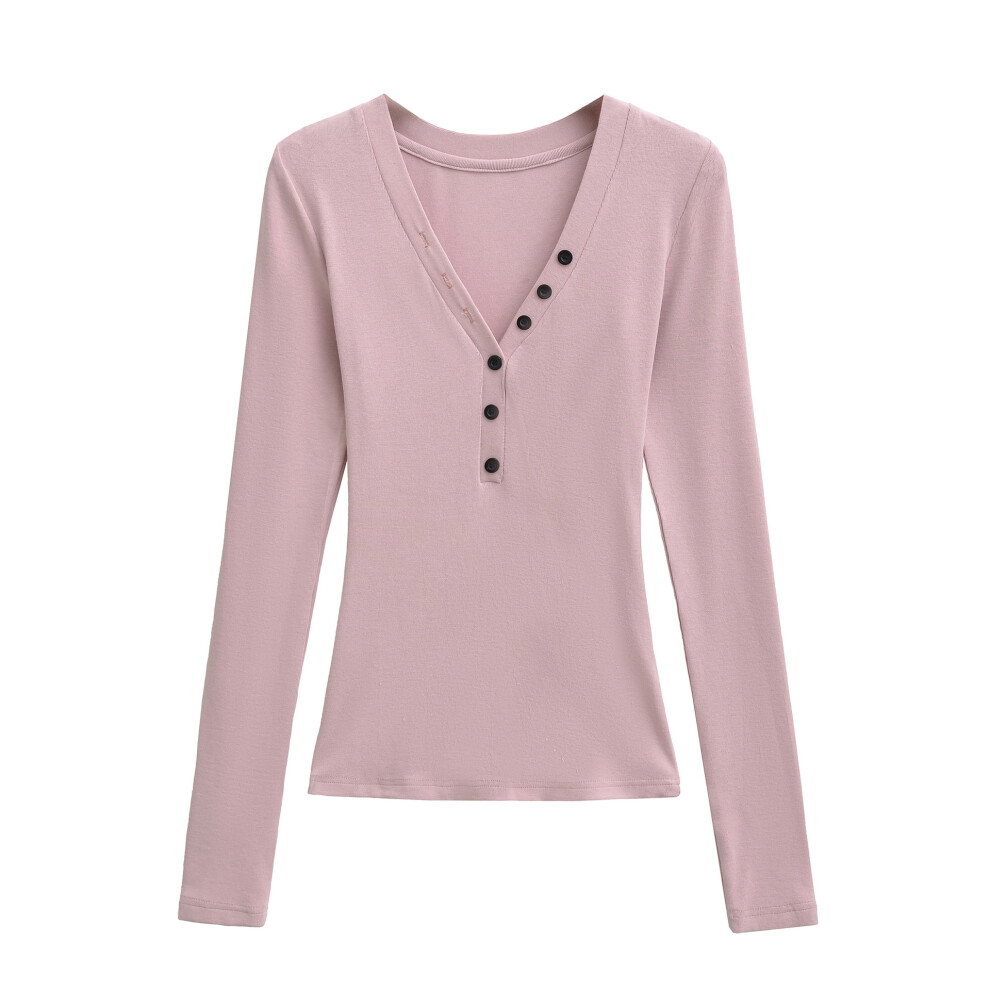 (Pink, S) Hot girl V-neck long-sleeved T-shirt female Henry collar inner layering shirt outer wear early autumn slim-fitting top ten colors