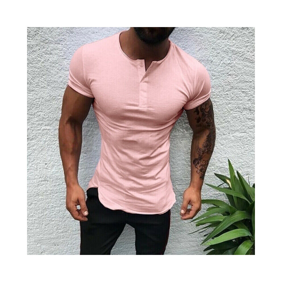 (Pink, M) Men's slim short-sleeved T-shirt muscle Henry shirt
