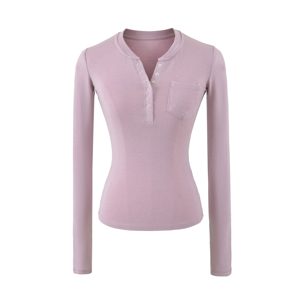 (Pink purple, M) American Henry White Slim Long Sleeve T Women's Autumn and Winter Slim Low Collar Bottoming Shirt Half Open Collar Top