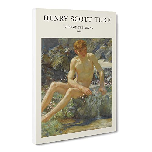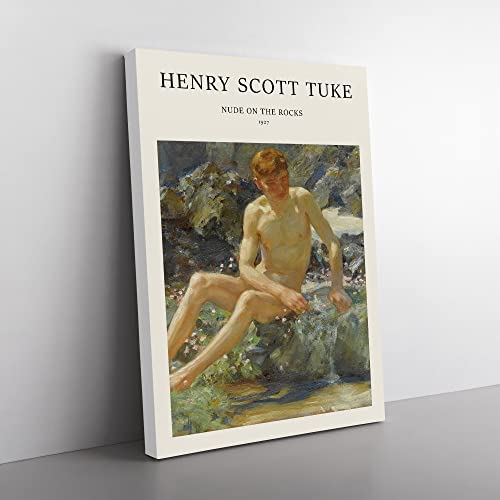 Nude Man On The Rocks By Henry Scott Tuke Exhibition Museum Painting Canvas Wall Art Print Ready to Hang, Framed Picture for Living Room Bedroom Home Office Décor, 30x20 Inch (76x50 cm)