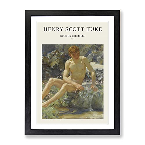 Nude Man On The Rocks By Henry Scott Tuke Exhibition Museum Painting Framed Wall Art Print, Ready to Hang Picture for Living Room Bedroom Home Office Décor, Black A4 (34 x 25 cm)