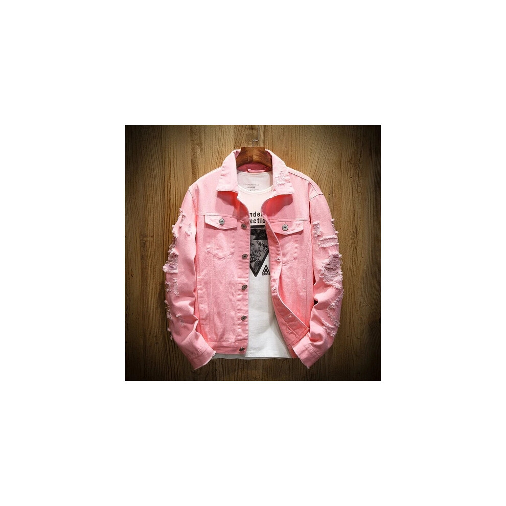 (pink, M) Men Coat Denim Jacket Ripped Jean Distressed Button Jackets Overcoat Casual UK