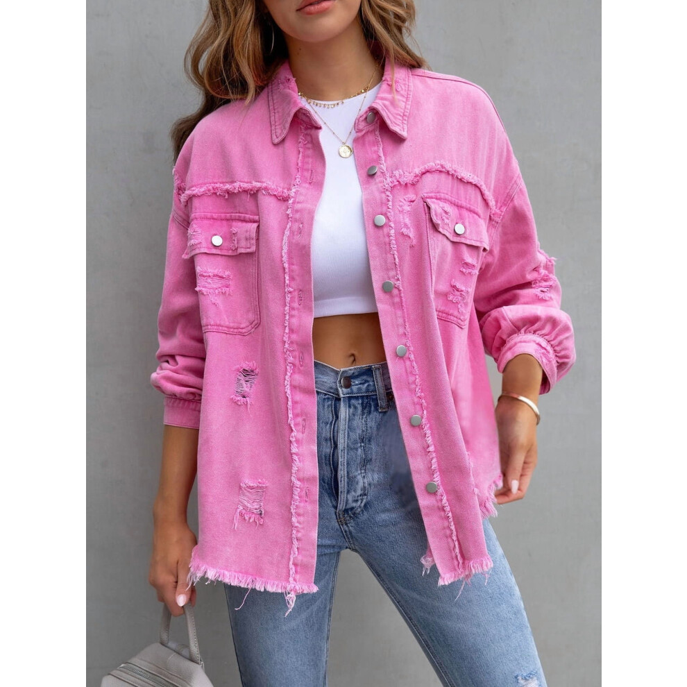 SEARIPE Women's Casual Denim Jacket Frayed Hem Ripped Long Sleeve Jean Jacket With Pockets Pink M