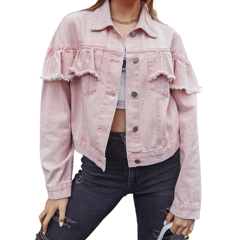 (L, Pink) Women's Ruffle Denim Jacket Long Sleeve Turn Down Collar Button Down Jean Jacket Biker Coat