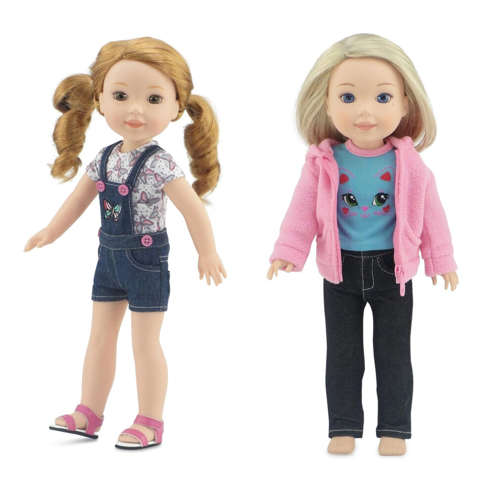 Emily Rose 14 Inch Fashioh Doll Clothes 6-PC Bundle Set; Overall Jean Shorts Outfit Including Sandals Plus Pink Fleece Coat Jacket Set with Stretch