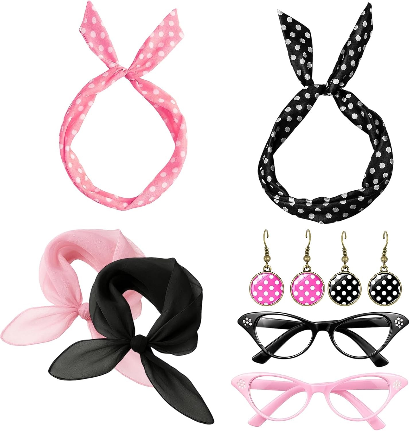 TUONYIS 8 Pcs 50s Costume Accessories 1950s Dresses for Women Pink Ladies,1950s Fancy Dress Kit Cat Eye Glasses Polka Dot Bandana Tie Headband Earrings Ladies Grease for Girl Women Retro Party Decor