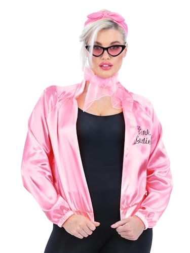 Pink Ladies Jacket, Pink Ladies Fancy Dress for Adults, Lady Grease Costume 1950s Accessories for Women, Cat Eye Glasses, Polka Dot Headband, Silk Scarf Earrings, World Book Day Costumes Adults