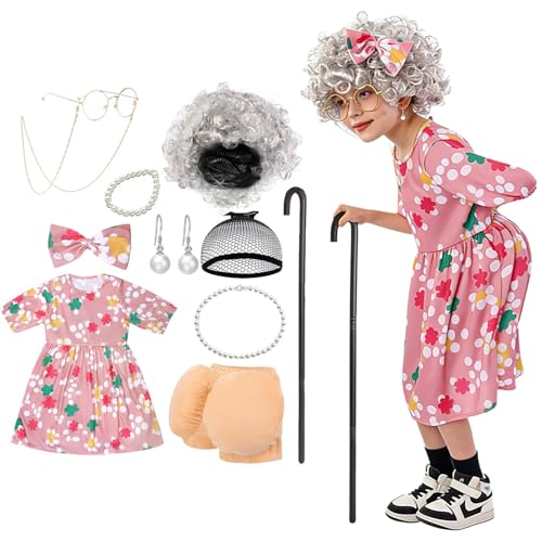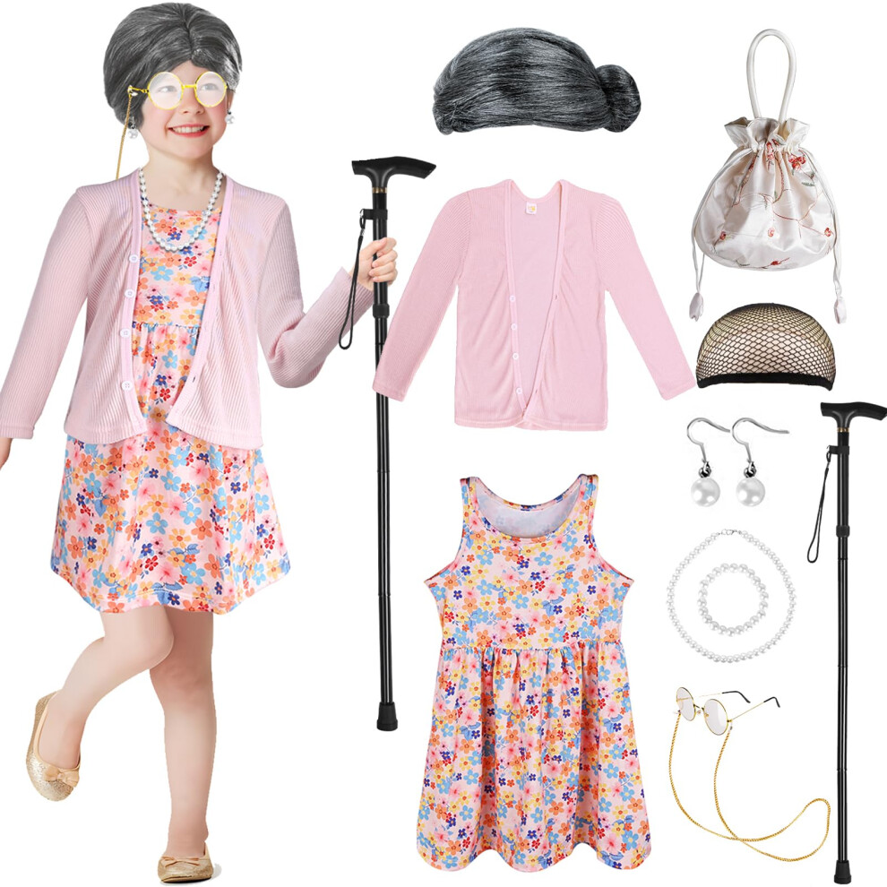 Minggo 17 pcs Old Lady Costume for Kids 100 Days of School Costume Granny Dress Up Wig for Girls Halloween Grandma Costume (Pink 5-7 yr)