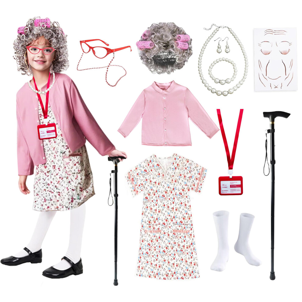 Jurebecia Girls 100 Days of School Costumes Little Old Lady Halloween Cosplay Costume Kids Granny Grandma Dress Up Outfit Pink 7-8 Years