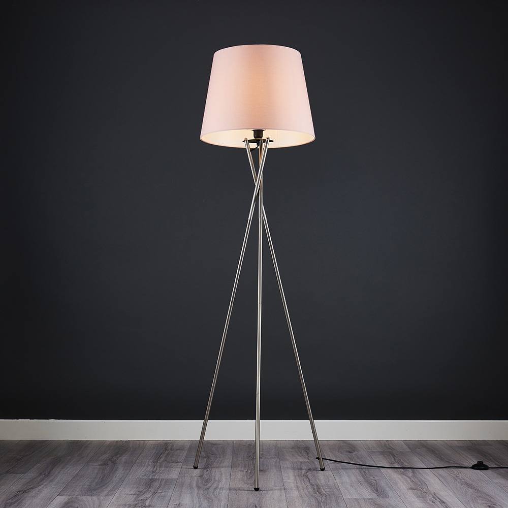 ValueLights Camden Brushed Chrome Tripod Floor Lamp with Pink Tapered Lamp Shade in Pale Pink