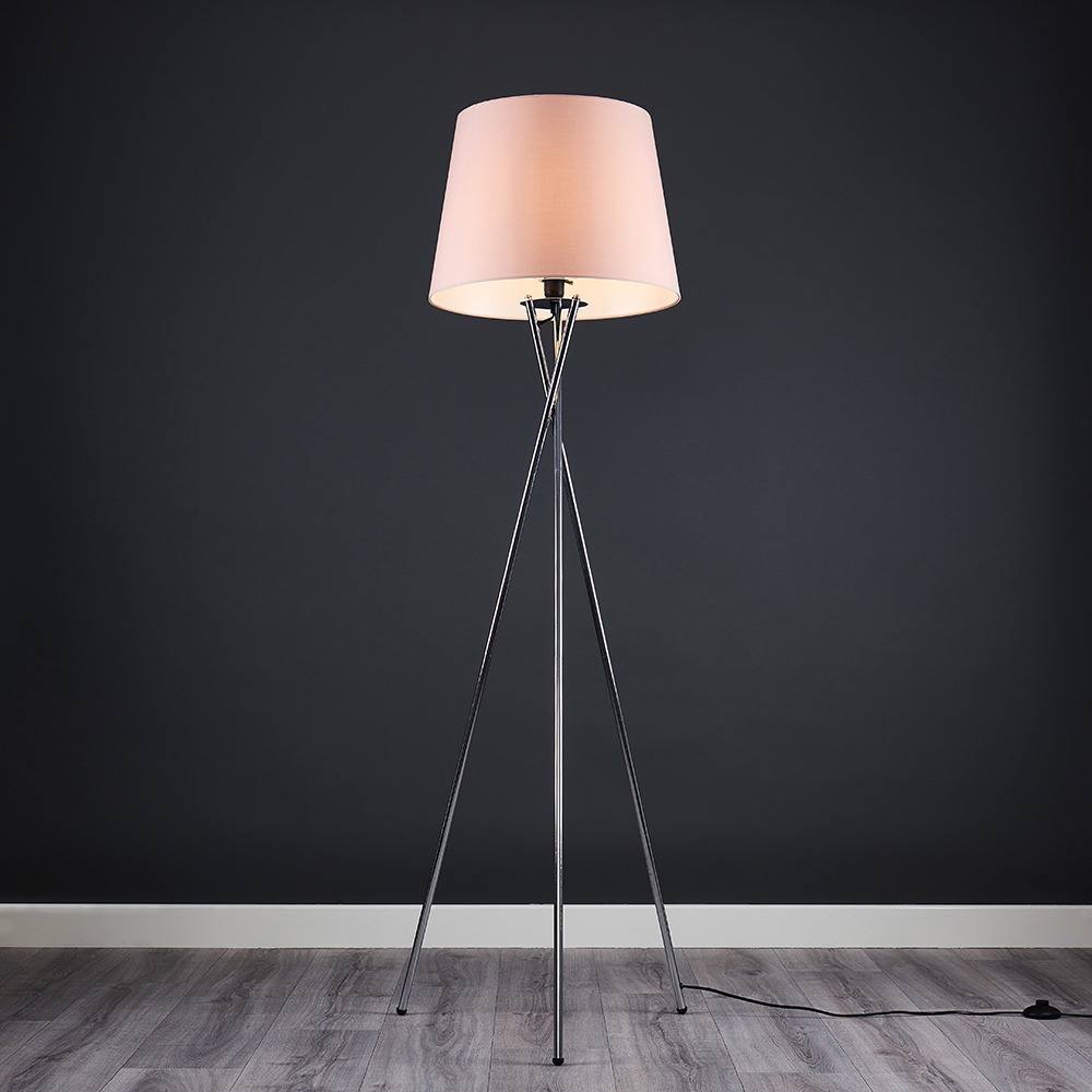 ValueLights Camden Polished Chrome Tripod Floor Lamp with Pink Tapered Lamp Shade in Pale Pink