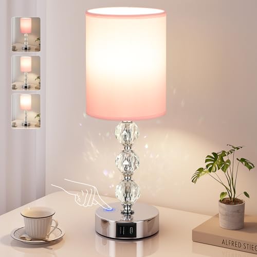 Aooshine Touch Pink Table Lamp, Crystal Bedside Lamps with 3 Way Dimmable, Small Bedside Lamp with USB C+A Charging Ports, Bedroom Lamps with Pink Fabric Shade for Living Room (LED Bulb Included)