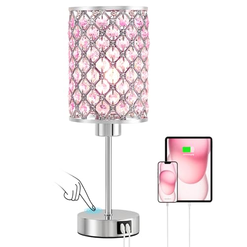 GyroVu Crystal Table Lamp, Pink Lamp with USB C+A Ports, Touch Dimmable with Crystal Shade for Bedside Girl Bedroom Living Room(Bulb Included)