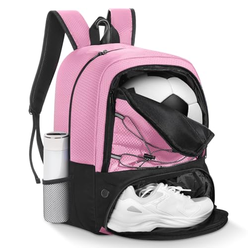 MoKo Soccer Bag Backpack, Basketball Backpack for Men & Women with Separate Ball and Shoes Compartments, Water-Resistant, Fence Hook, Sports Equipment Bag for Clothes, Shoes, Tablets, Laptops, Pink