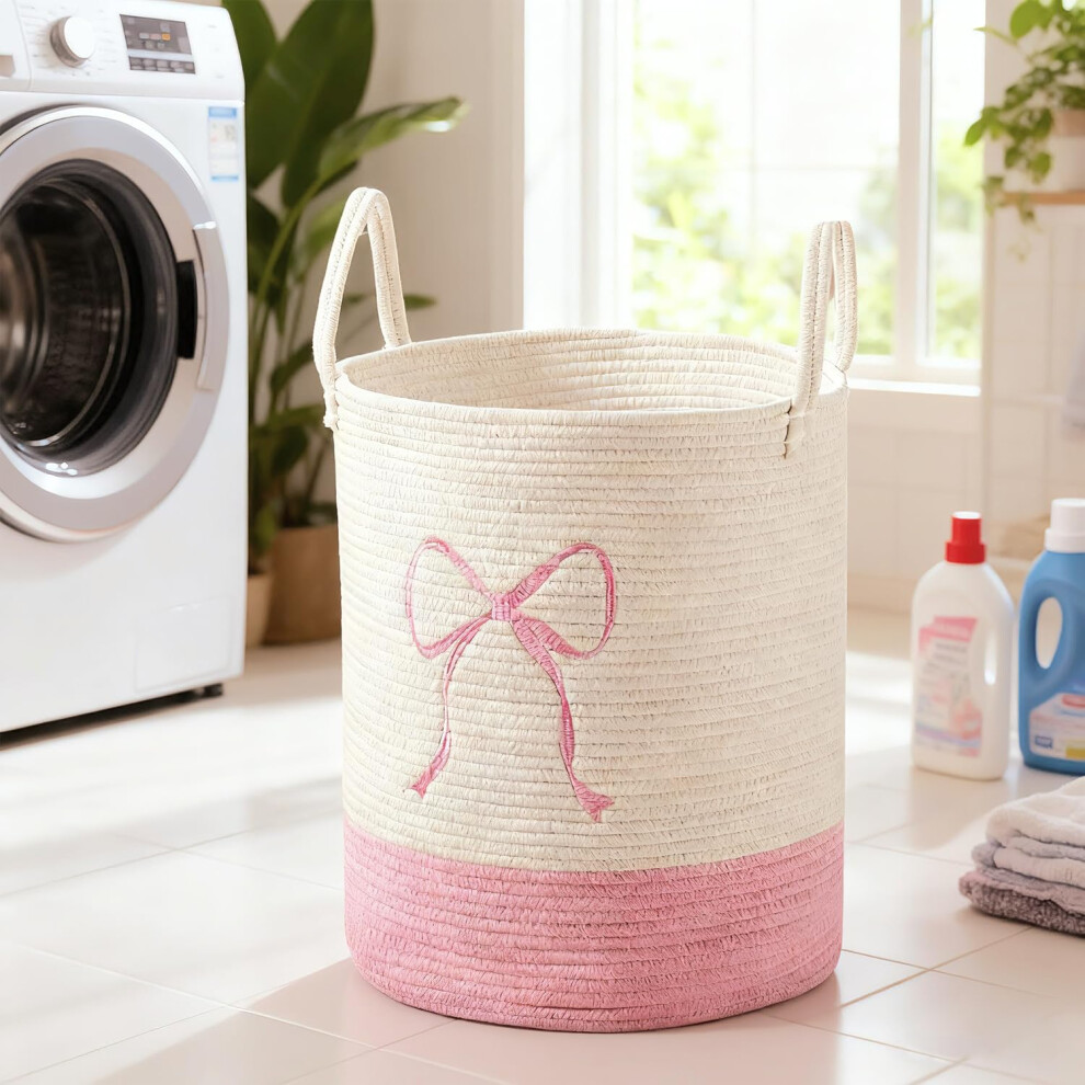 Pink Laundry Basket with Handles, Large 50L Soft Cotton Rope Hamper with Charming Bow for Nursery