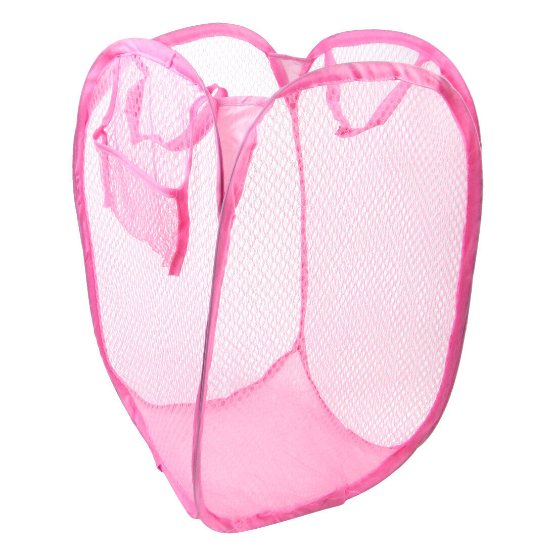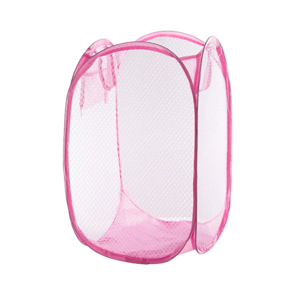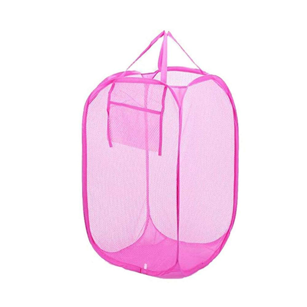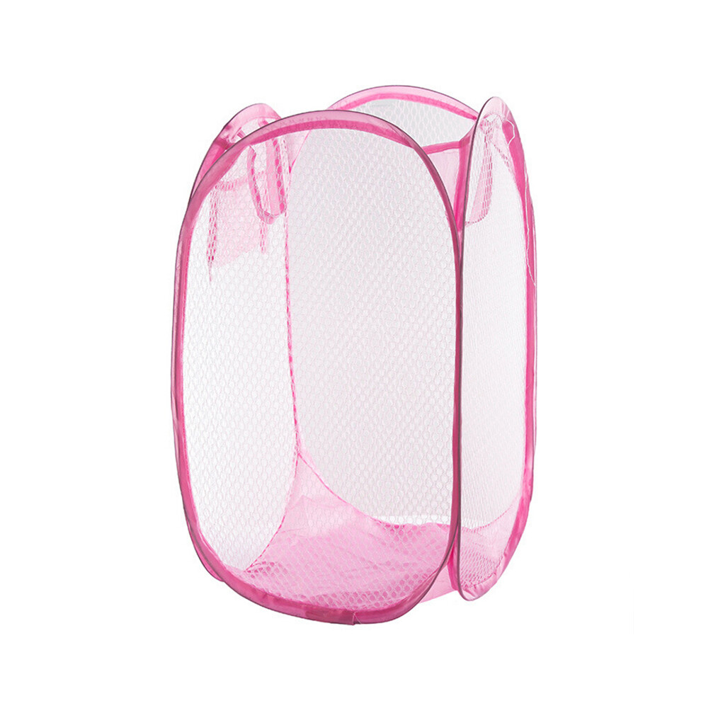 Clothes Storage Case Folding Pink Meshy Laundry Basket Hamper w Hand Strap