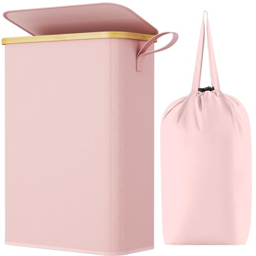 Lifewit 50L Slim Laundry Basket with Lid, Foldable Laundry Hamper Drity Clothes Washing Basket Toys Towels Storage with Bamboo Handle, Removable Inner Bag for Bedroom Bathroom,Pink