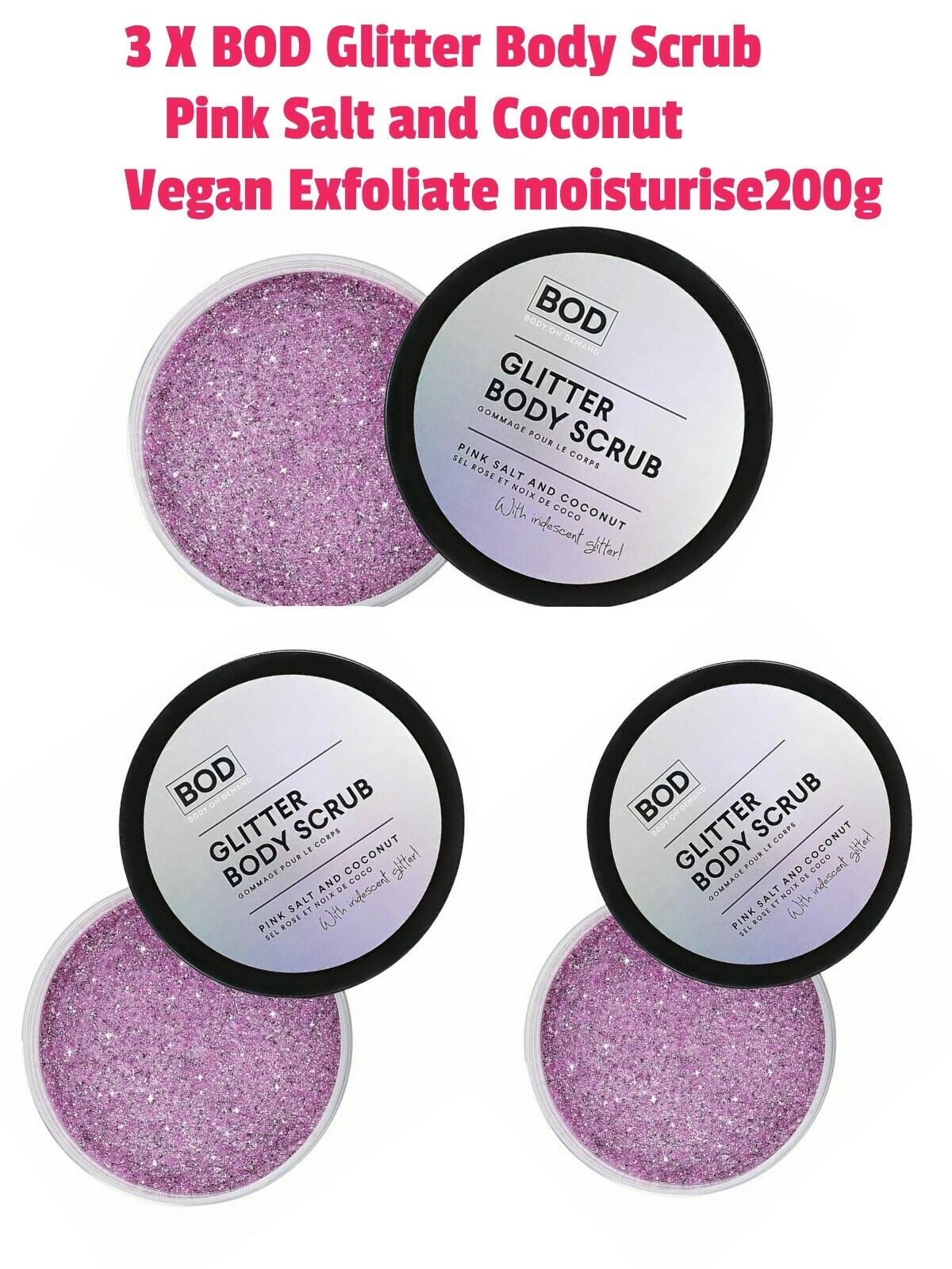 BOD Glitter Body Scrub Pink Salt & Coconut Vegan Exfoliating Moisturiser 3x 200g