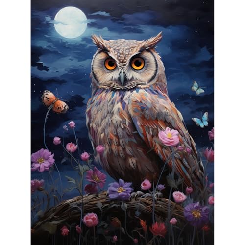 Majestic Owl Portrait Oil Painting Great Horned Purple Pink Blue Full Moon in Spring Meadow with Wildflowers Artwork Framed Wall Art Print A4