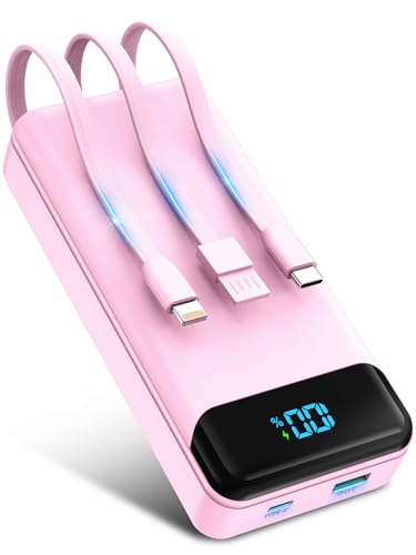 Charmast Power Bank with Built in Cables,10000mAh USB C Battery pack 6 Outputs 3 Inputs with LED Display Type C Powerbank Portable Charger Compatible with Smartphones Tablets and More(Pink)
