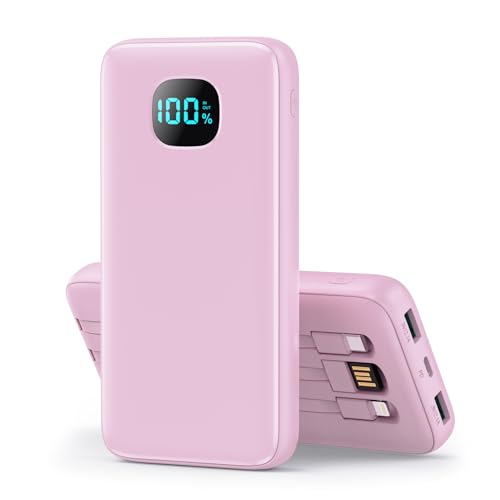 Flowhole Power Bank 27000mAh, Portable Charger PD20W & QC3.0 Fast Charging with Built-in 3 Cables, 4 Outputs & 3 Inputs Powerbank with LED Display for iPhone, Tablets and More(Pink)