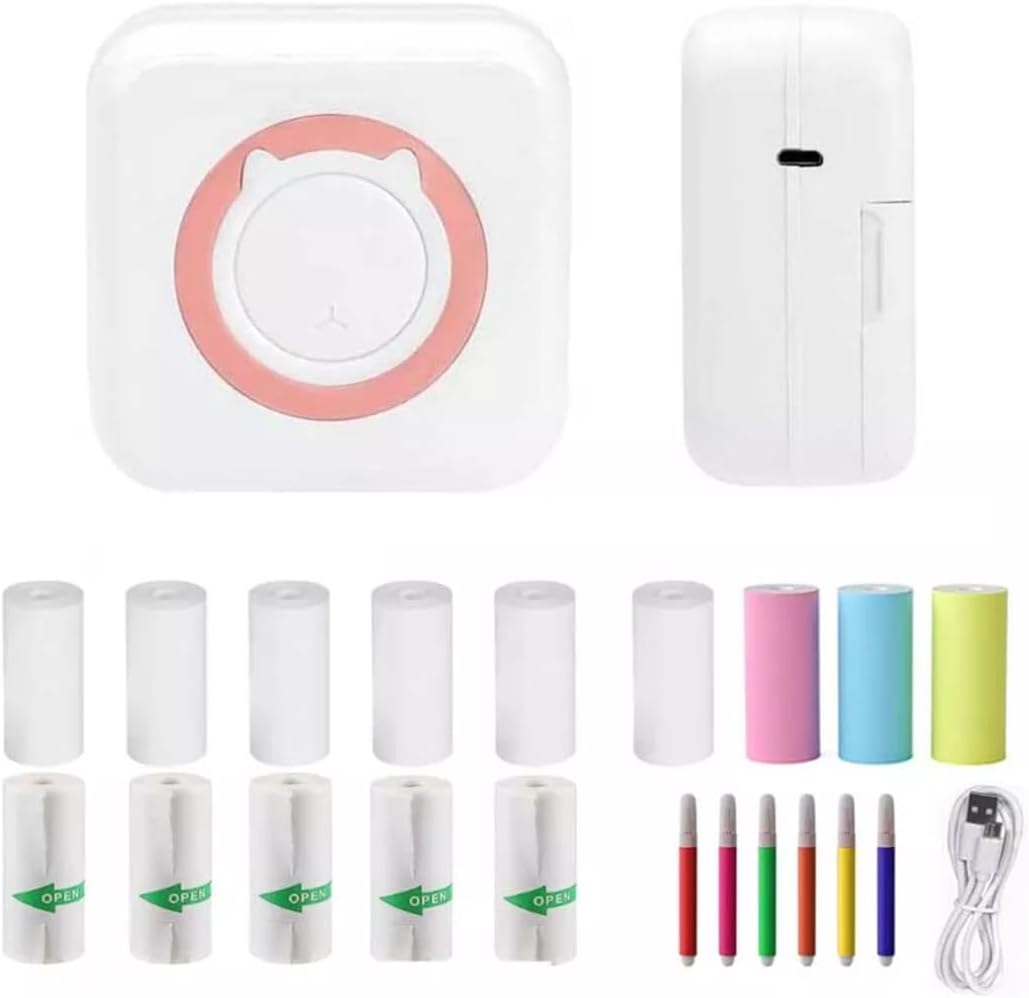 byepica Pink Inkless Printer with Cat Face, Wireless Portable Thermal Printer for Students, Includes USB and Thermal Paper