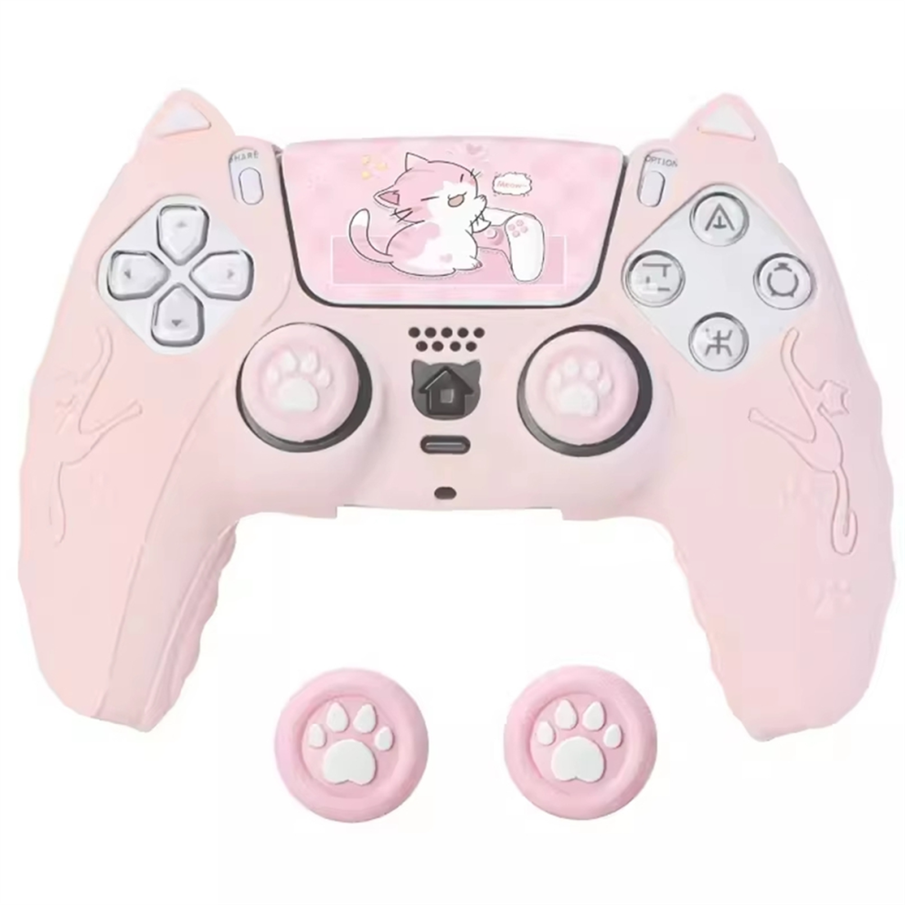 Pink Cat Paw PS5 Controller, Set with Hand Grip, Non-Slip Silicone Cover, Protective Protective Case with Joystick Pink