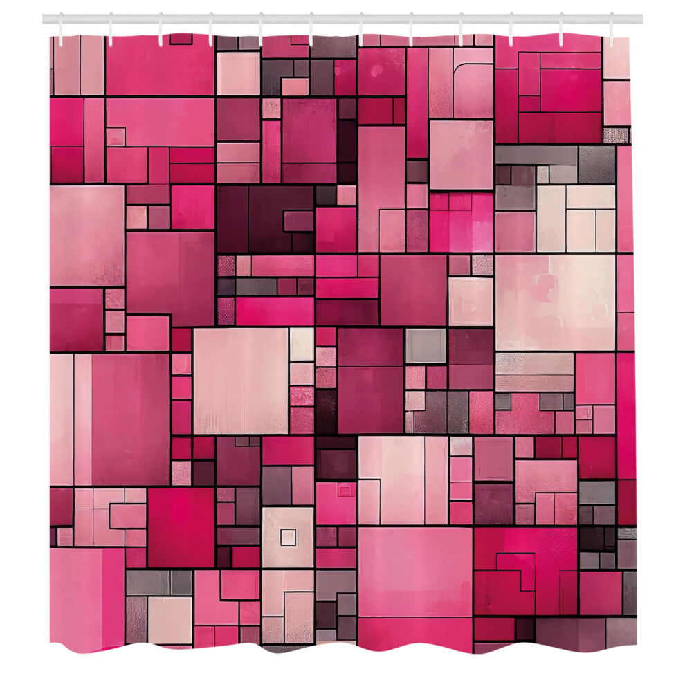 ABAKUHAUS Pink Shower Curtain, Blushy Y2K Squares Futurist, Cloth Fabric Bathroom Decor Set with Hooks, 175 x 200 cm, Magenta Dried Rose Pink