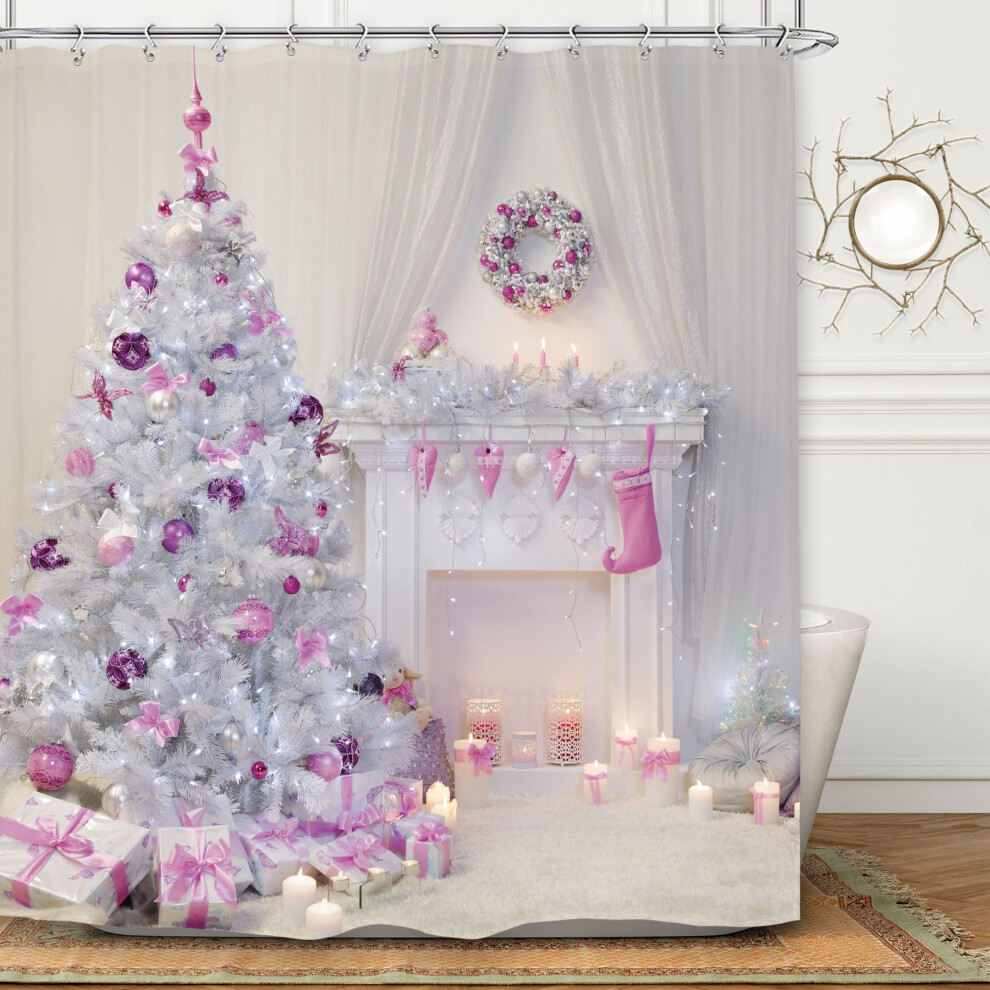 Purple Pink Christmas Shower Curtain Waterproof Bathroom Set with Fireplace Winter Holiday Decor 71x71 Inch