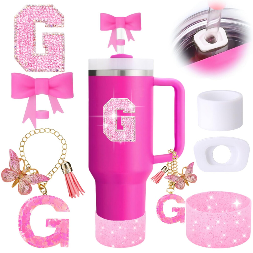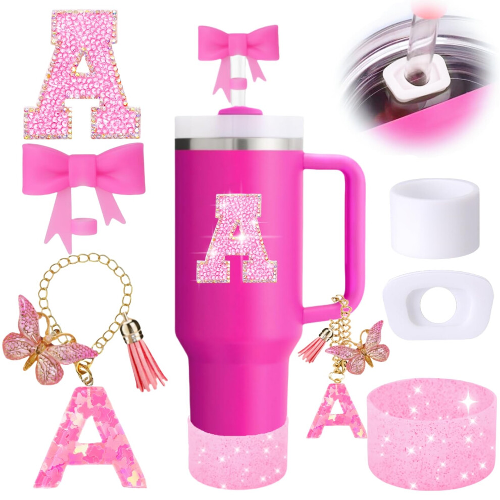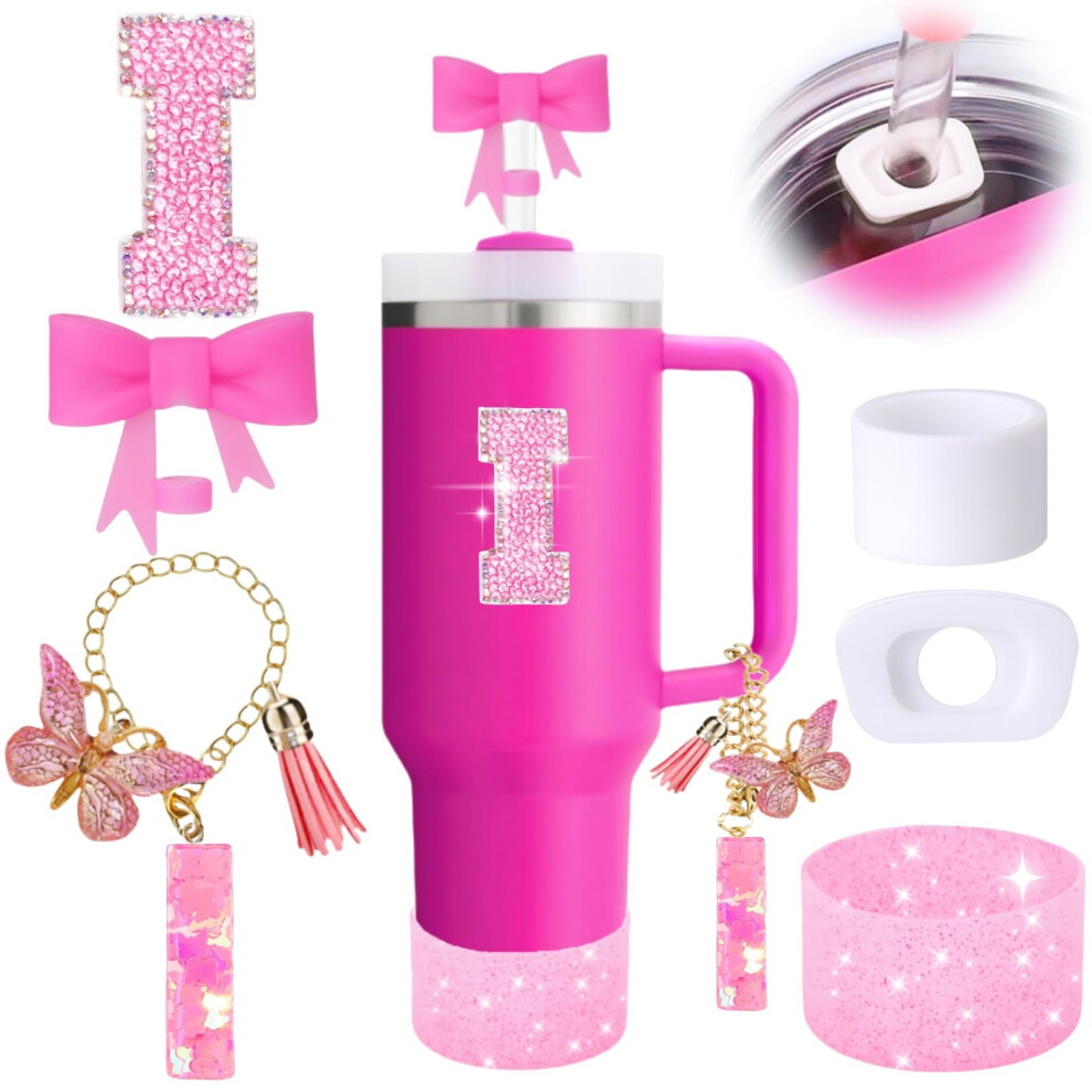 6PCS Pink Stanley Cup Accessories Set Initials Decorations for Stanley Cup 30oz 40oz Includes Bow Straw Topper Handle Charm Letter Sticker Silico