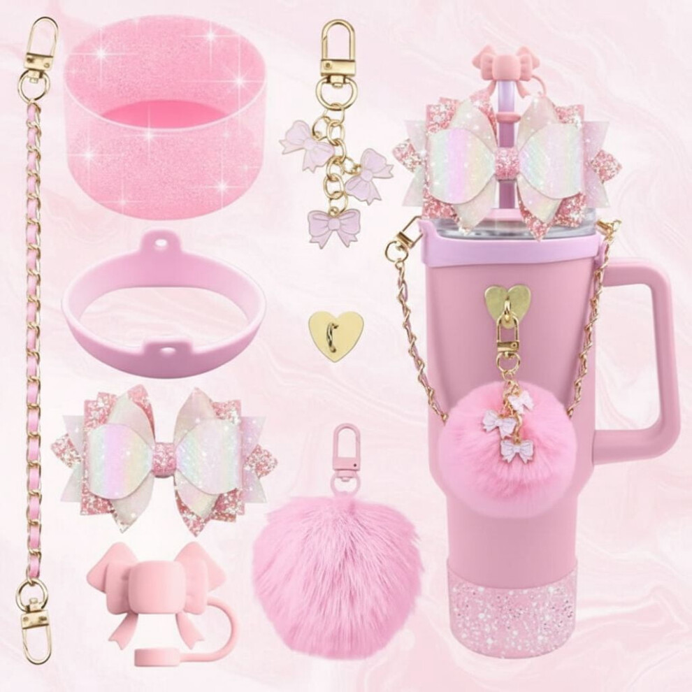 Bling Accessories for Stanley Cup 40oz & 30oz Tumbler: Silicone Bow Straw Topper, Boot, Leather Handle Strap, Charms (Pink) | Compatible with Stanley