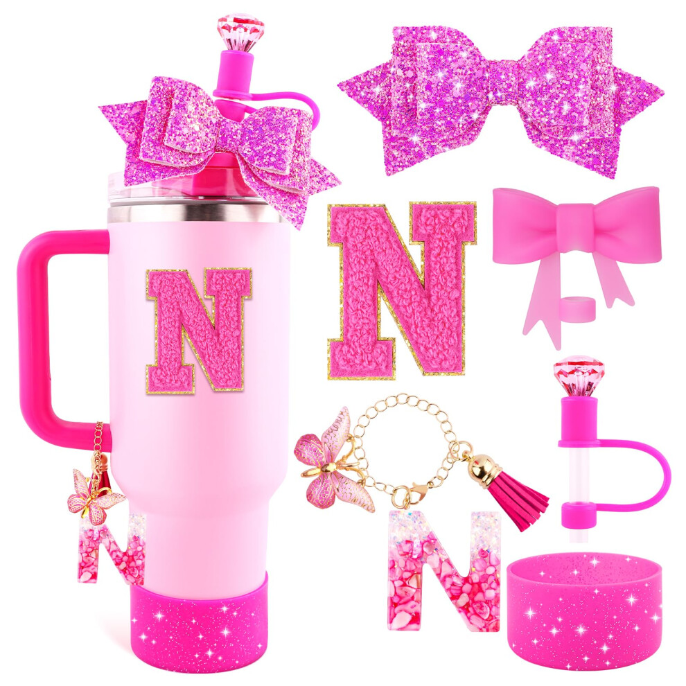 Lingdeer Pink Accessories Set for Stanley Cup 30Oz 40Oz, Bling Letter Charms, Diamond Straw Cover, Glitter Silicone Boot, Personalized Sticker, Bow Straw Topper for Stanley Cup Accessories (Letter N)