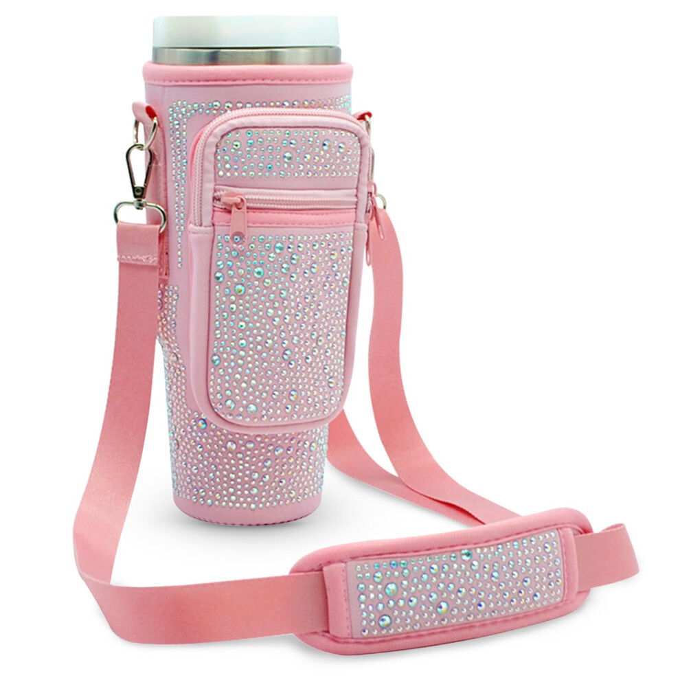 Cup Holder Bag for Stanley 40/30oz Tumbler with Adjustable Strap, Phone Pocket, Rhinestone Pink
