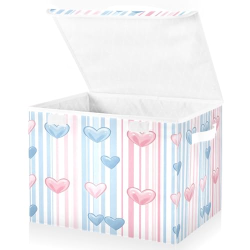 WQHPLMD Christmas Baskets Collapsible Storage Bins with Lids, Striped Blue Pink Hearts Storage Boxes Clothes Baskets for Organizing