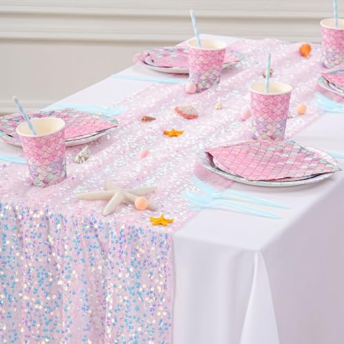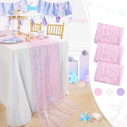 Mermaid Runner 3 Pieces Pink Table Runners 120 Inches Long Sequin Fabric for Girls Mermaid Birthday Decorations