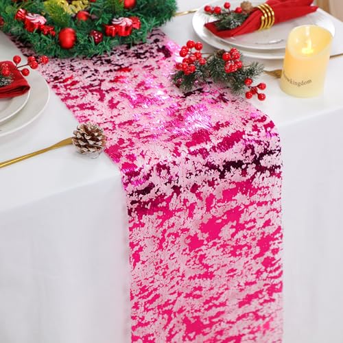 Snowkingdom 2 Pieces Hot Pink Table Runner, Sequin Glitter Foil Metallic Thin Mesh Roll 11"x108", Table Decorations for Event Party, Wedding, Birthday, Christmas