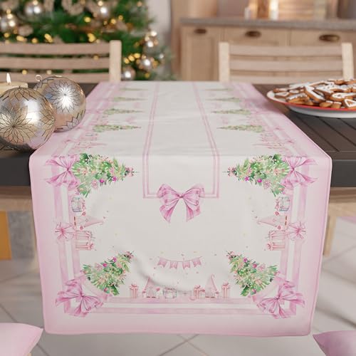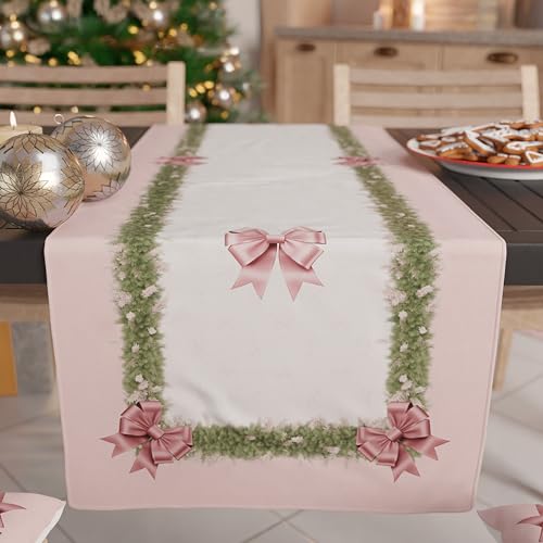 PETTI Artigiani Italiani - Christmas Table Runner, Kitchen Runner 140x40 cm, Elegant Christmas Table Runner with Pink Bow and Feathers, 100% Made in Italy