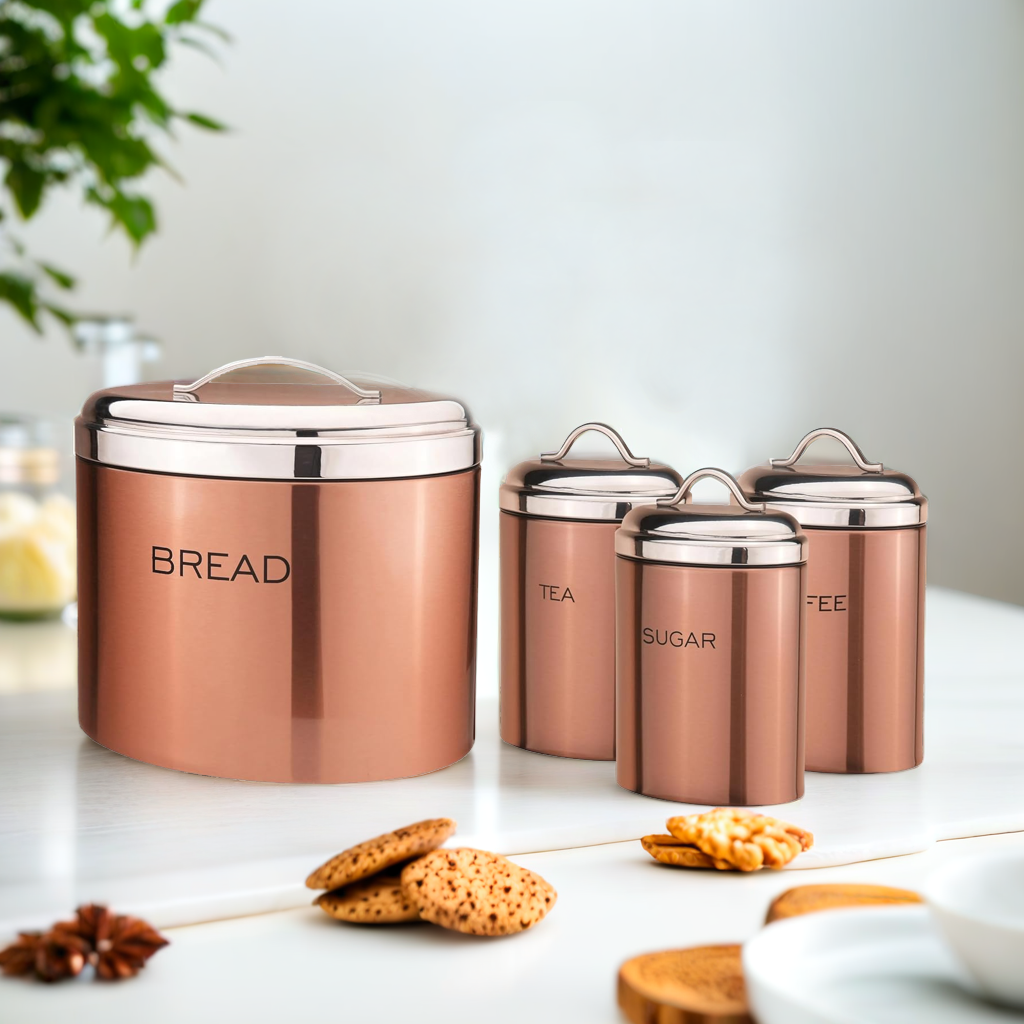4 Piece Kitchen Storage Set Airtight Bread Bin & Canisters for Tea Coffee Sugar