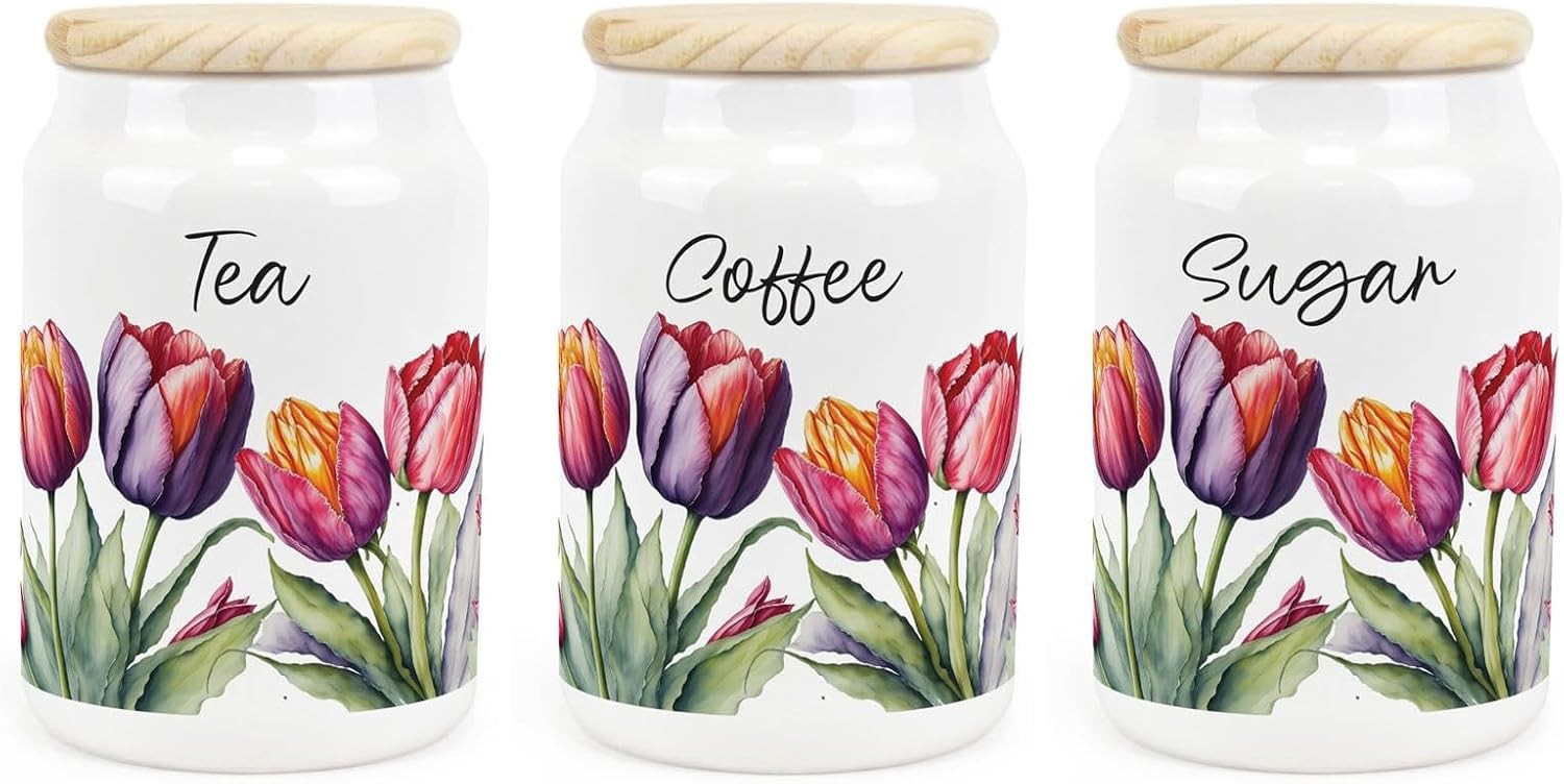 Tulips Ceramic Tea Coffee Sugar Storage Canisters - Pink & Purple Floral Gifts