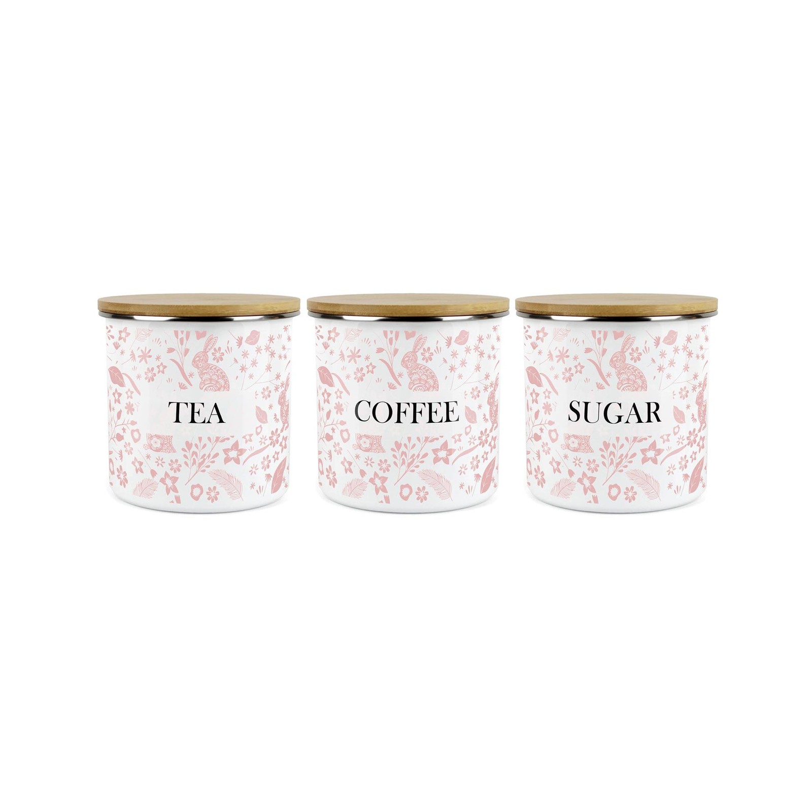 Wild Rabbits Tea Coffee & Sugar Enamel Jar Storage Canister Set - Pink