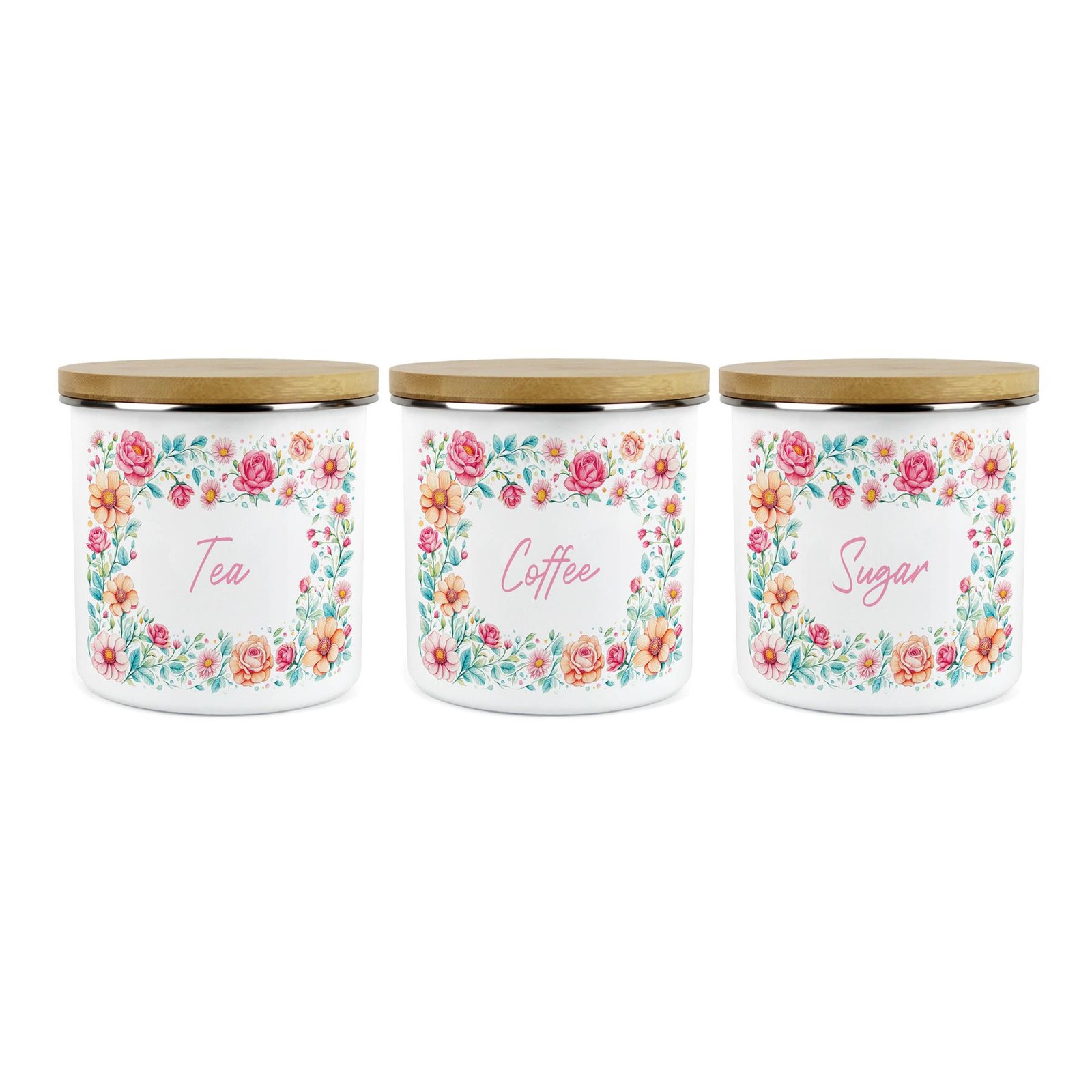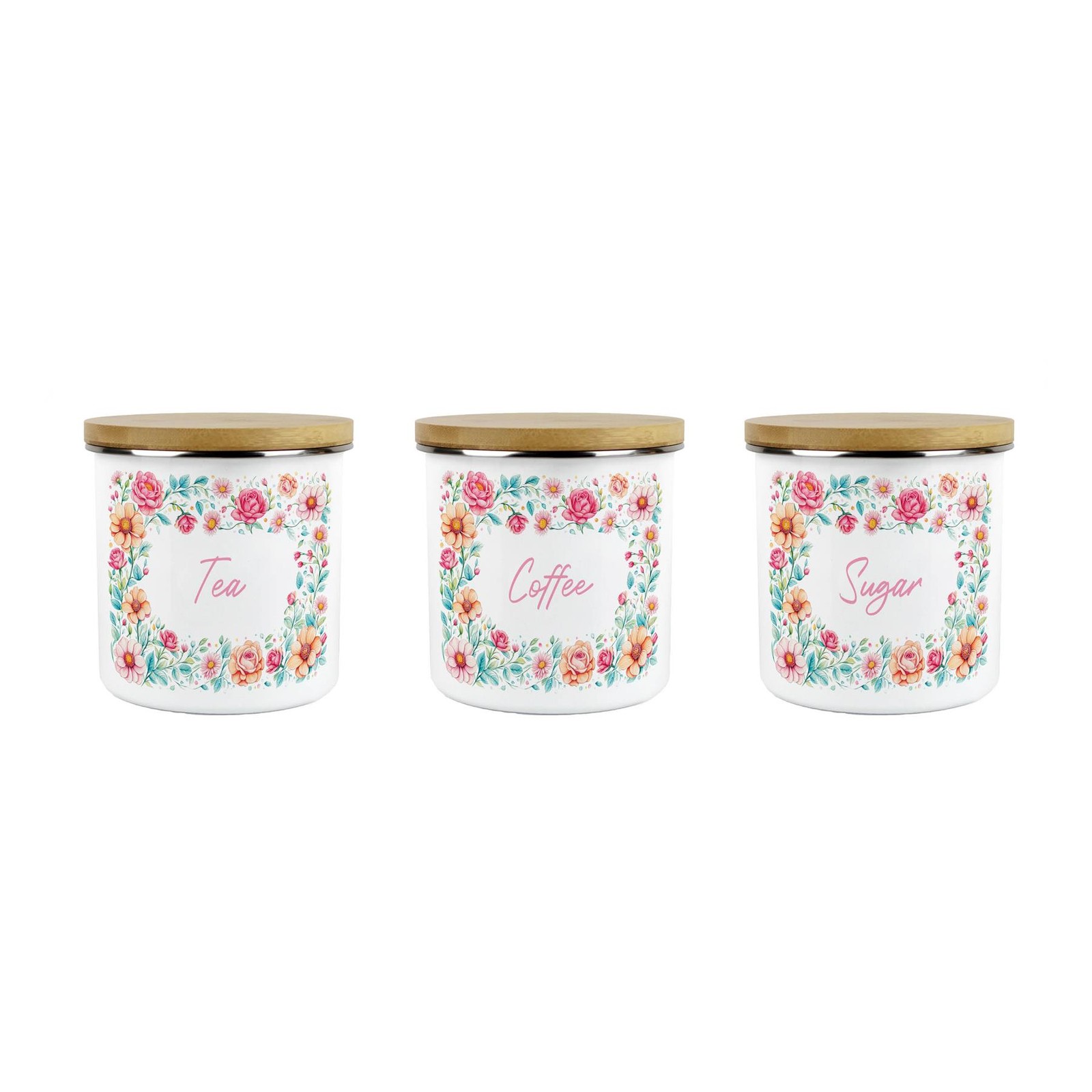 Pink Roses Tea Coffee Sugar Canister Set - Enamel 600ml Kitchen Storage Gifts