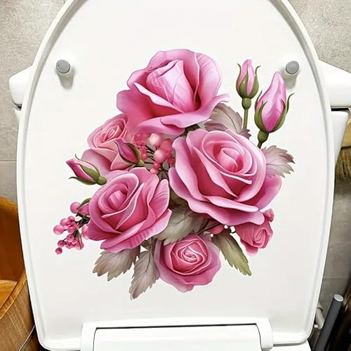 Blooming Pink Rose Flower Romantic Toilet Cover Sticker Decals,Flower Leaf Butterfly Waterproof Toilet Lid Tank Seat Decals Cistern Self-Adhesive Bathroom Wall Sticker
