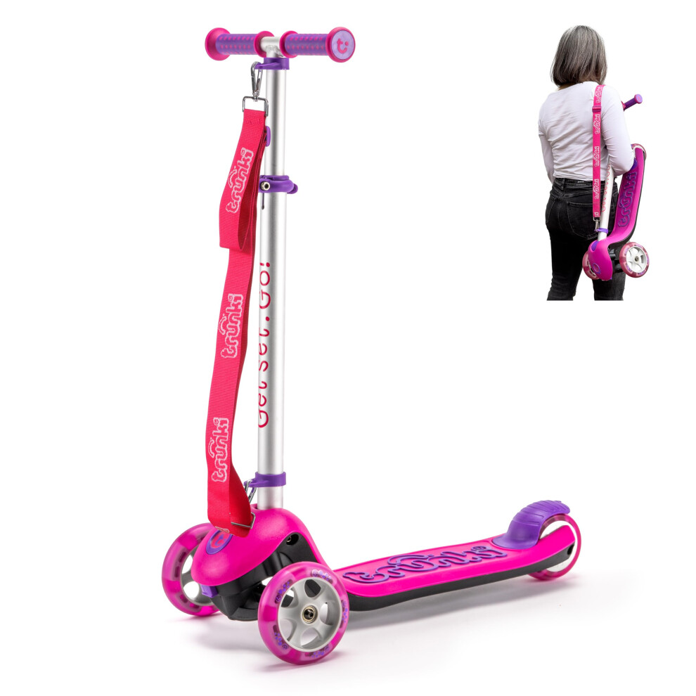 Trunki Folding 3 Wheel Kids Scooter for Girls with Tow and Carry Strap and Storage bag | Adjustable Handle Bar Height | Large Pink Scooter for Kids