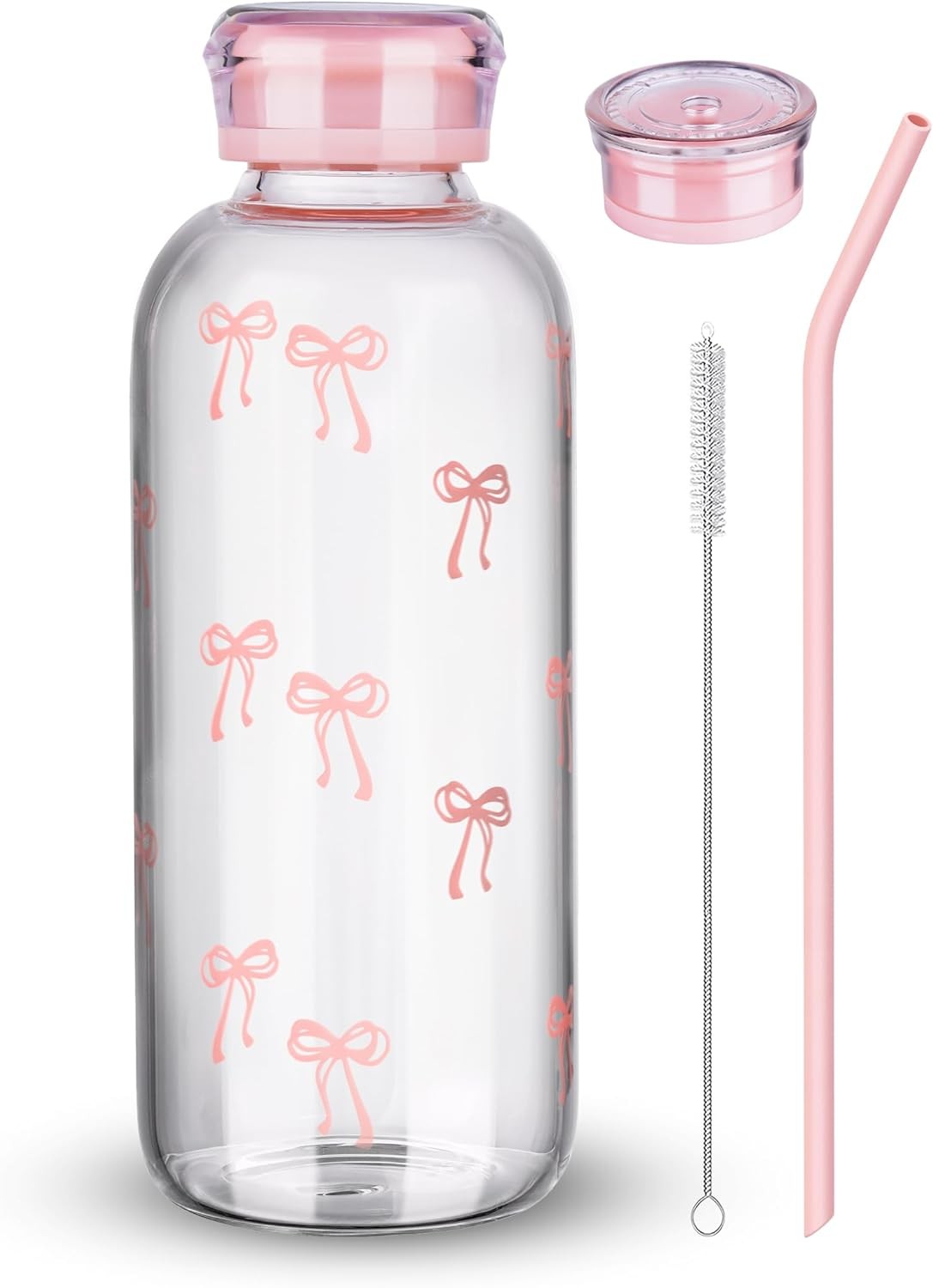 NiHome 25oz/750ml Pink Bow Glass Water Bottle with Silicone Straw, 2 Lids, Clea