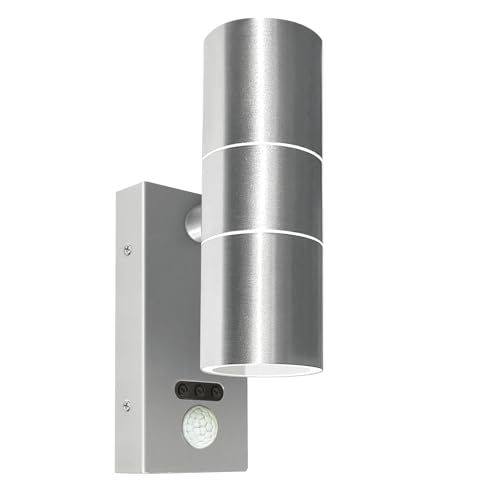 Kerry Outside Wall Lights with Sensor, IP65 Waterproof Up Down Outdoor Lighting, External Pir Wall Mount Security Light, Silver Stainless Steel Exterior Light Mains Powered for Front Door (Bulb Excl.)