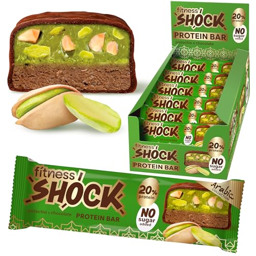 Fitnesshock Protein Bar 12pcs no added sugar, 10g protein, low carb (5g), rich in fibre, low calorie, 12-pack fitness chocolate bars box, palm oil free, no flour, 12x50g pistachio flavour
