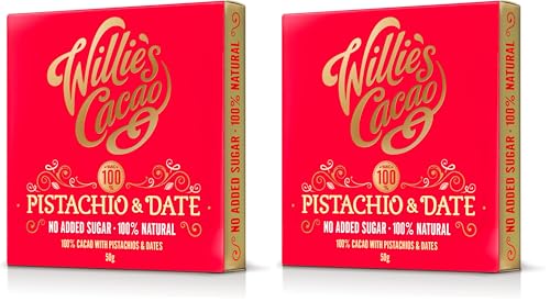 Willie's Cacao - 100% Cocoa with Pistachio & Date - No Added Sugar Chocolate bar - 50g - Naturally sweetened with fruit and nuts - Vegan - Artisan made (Pack of 2)