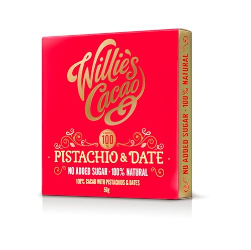 Willie's Cacao - 100% Cocoa with Pistachio & Date - No Added Sugar Chocolate bar - 50g - Naturally sweetened with fruit and nuts - Vegan - Artisan made