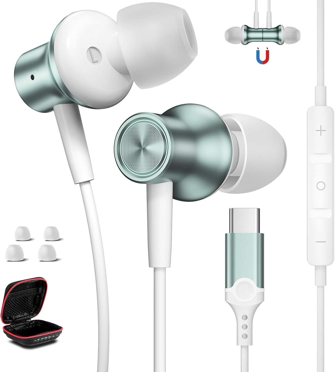 Surround Sound Quality Earbuds, USB Type C Wired Headphones for Samsung Galaxy S23 Ultra, Noise Cancelling for Pixel 7, Magnetic Design, Ergonomic