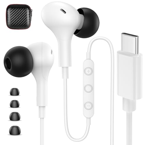 USB C Headphones for Samsung S25 S24 FE S23 Ultra A16 A17 A56 A36 iPhone 17 16 15 Pro Max Plus Earphones,Wired Earbuds In Ear Type C Headphones with Mic Volume Control for iPad Pro Pixel 9 10a,White